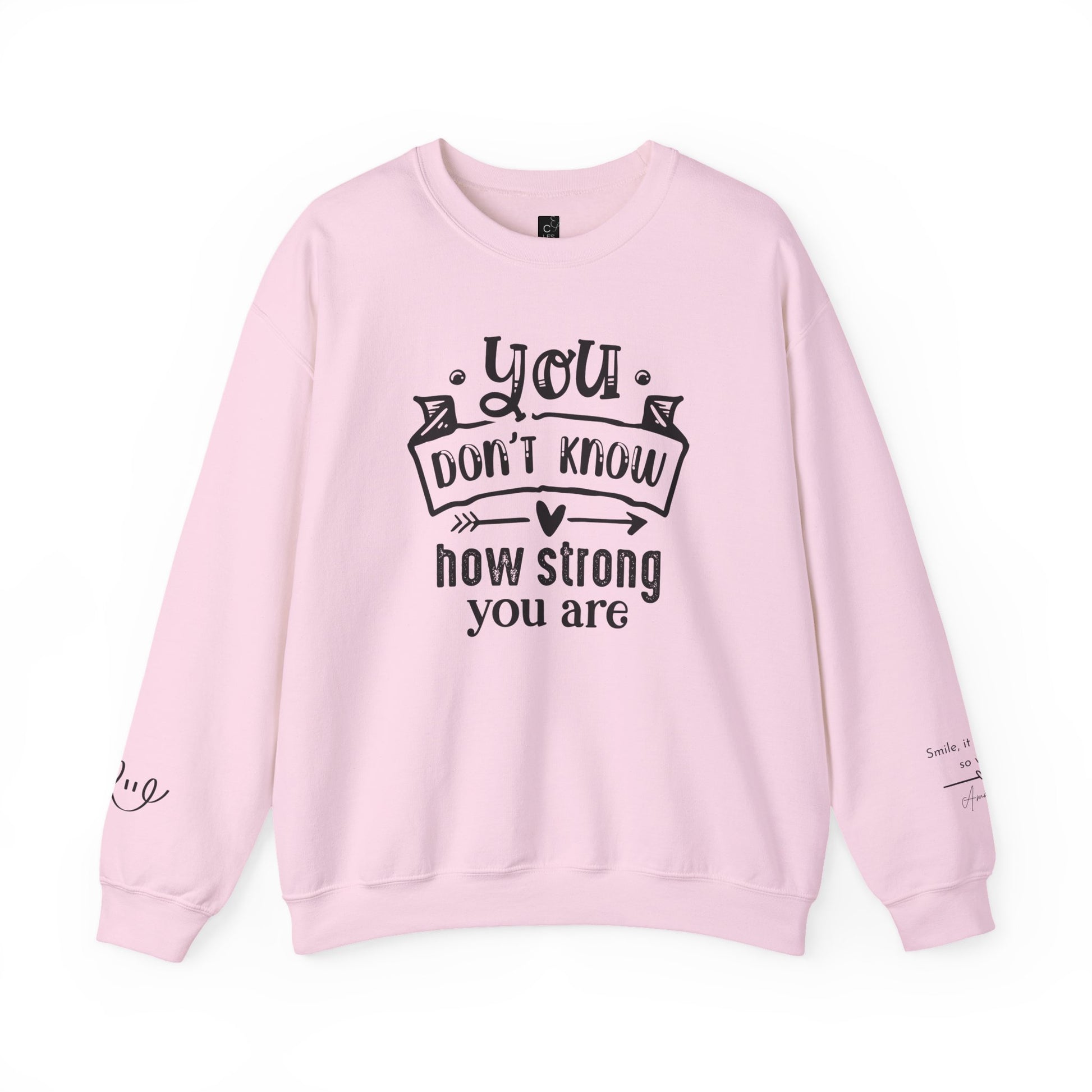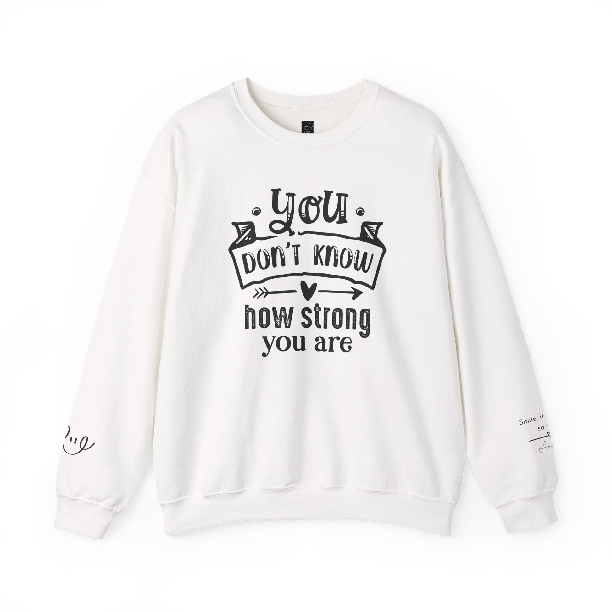 Ready to get cozy and feel unstoppable? Meet your new favorite crewneck sweatshirt. It's more than just a piece of clothing; it's a hug for your soul and a high-five for your strength. With the powerful message "You Don't Know How Strong You Are" boldly printed on the front, this isn't just a cozy apparel—it's a statement.